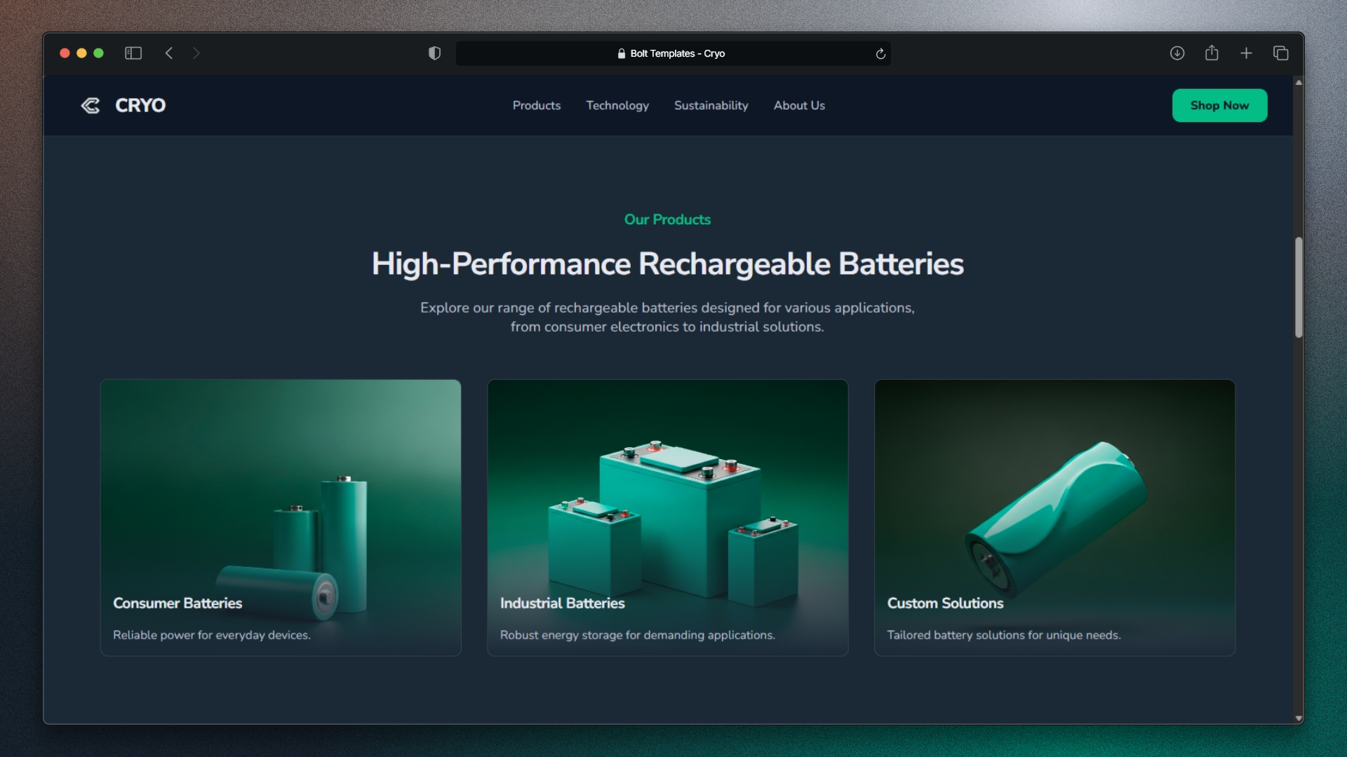 A website landing page for an eco-friendly battery manufacturing company with a minimal dark design and a CTA section.