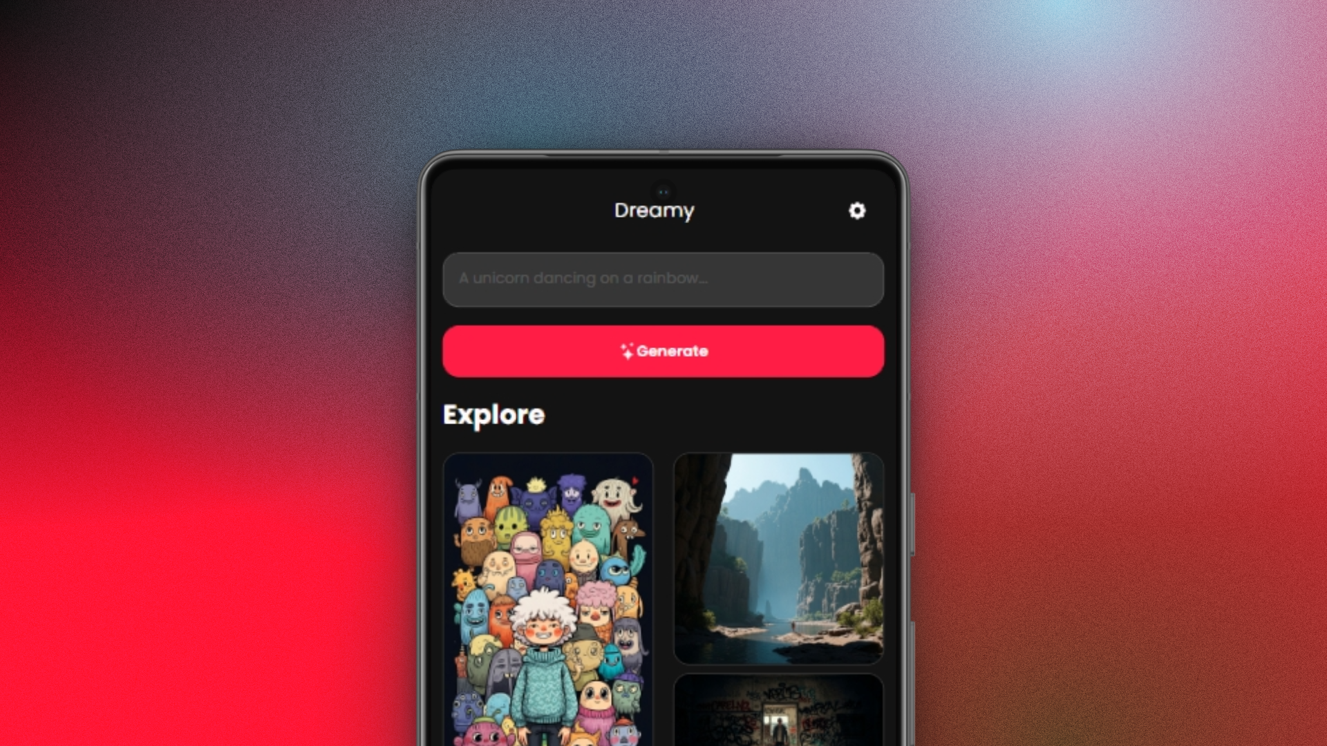 An AI image generator app using a minimal dark UI along with an image view in the Explore view.