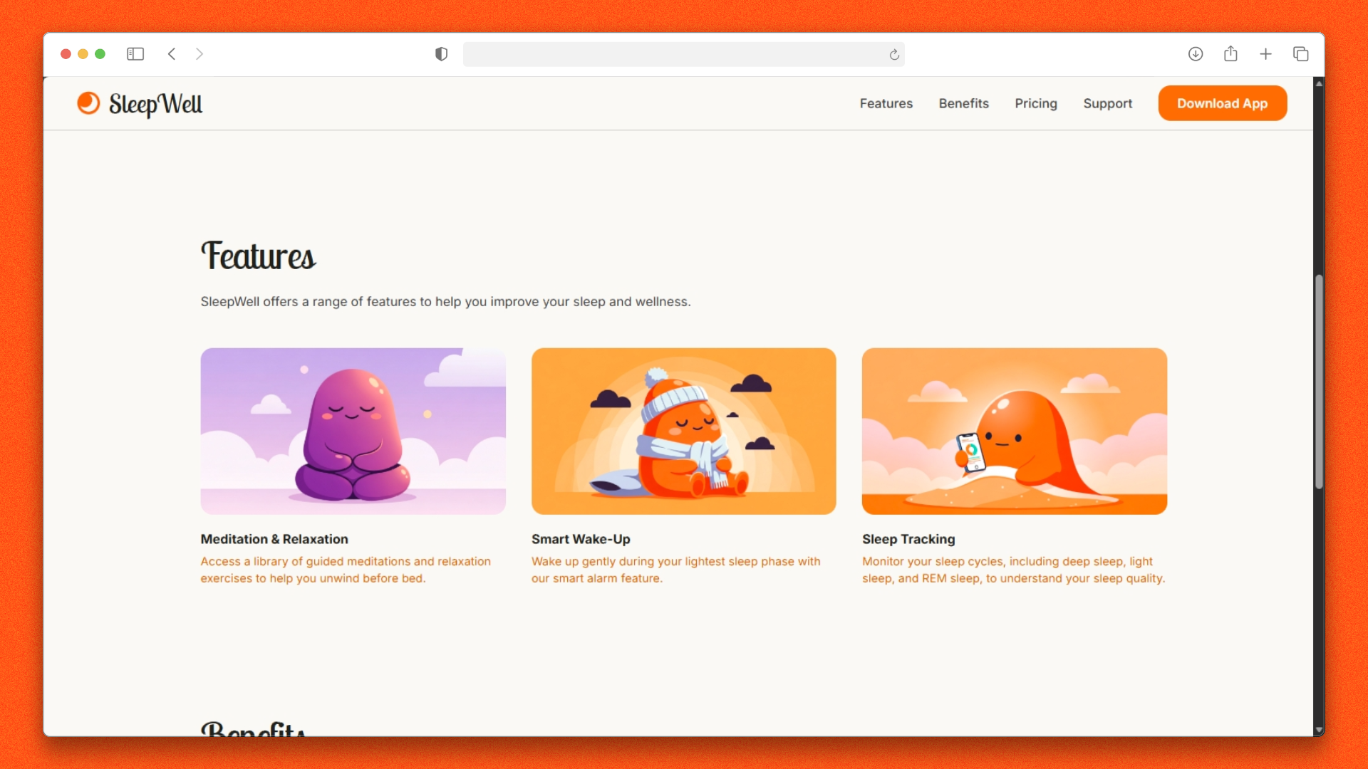 A website landing page for a sleep tracker app, featuring a cute and playfully minimal UI with a CTA section.